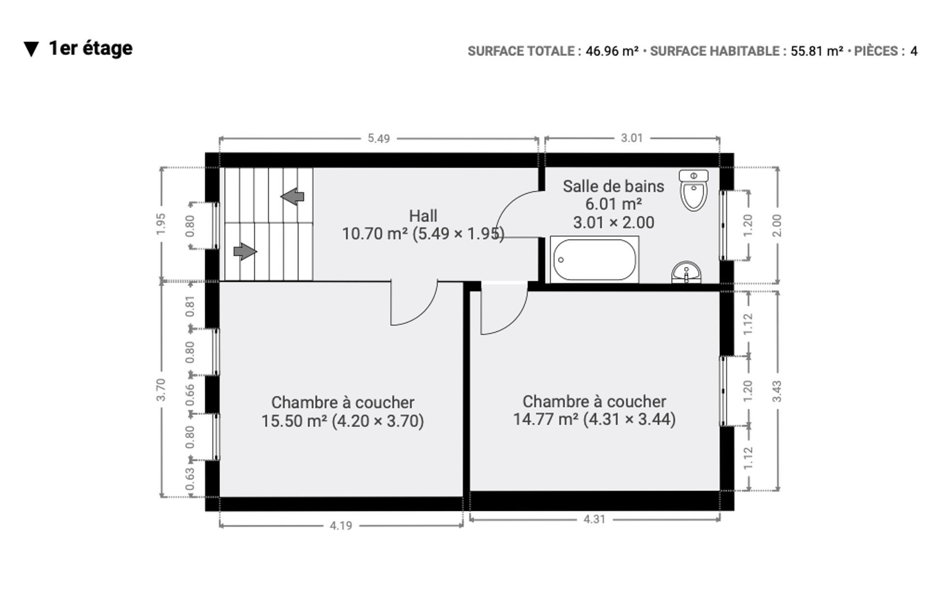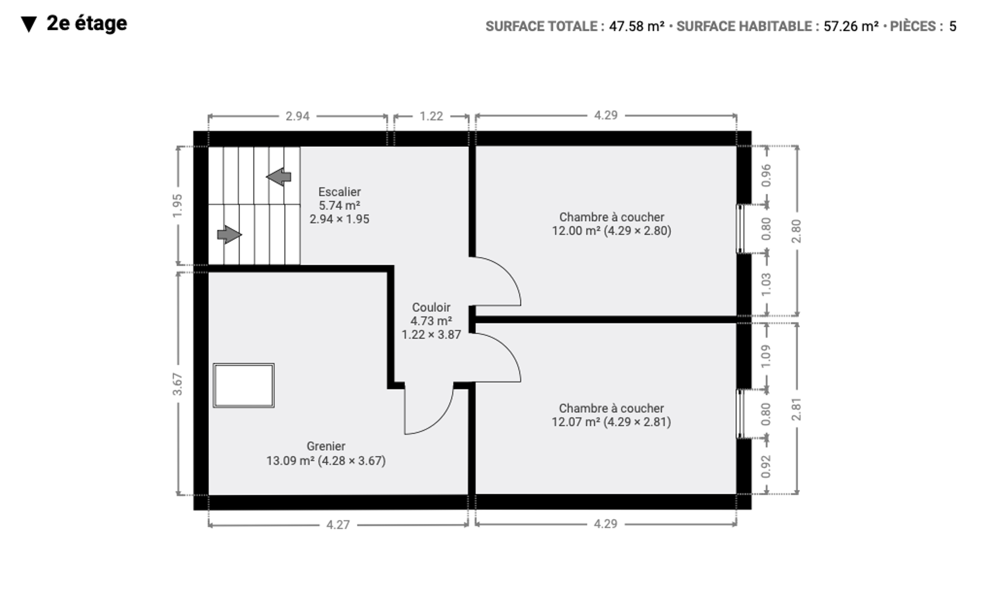 Deuxième étage : deux chambres supplémentaires et un grenier parfaitement aménageable.